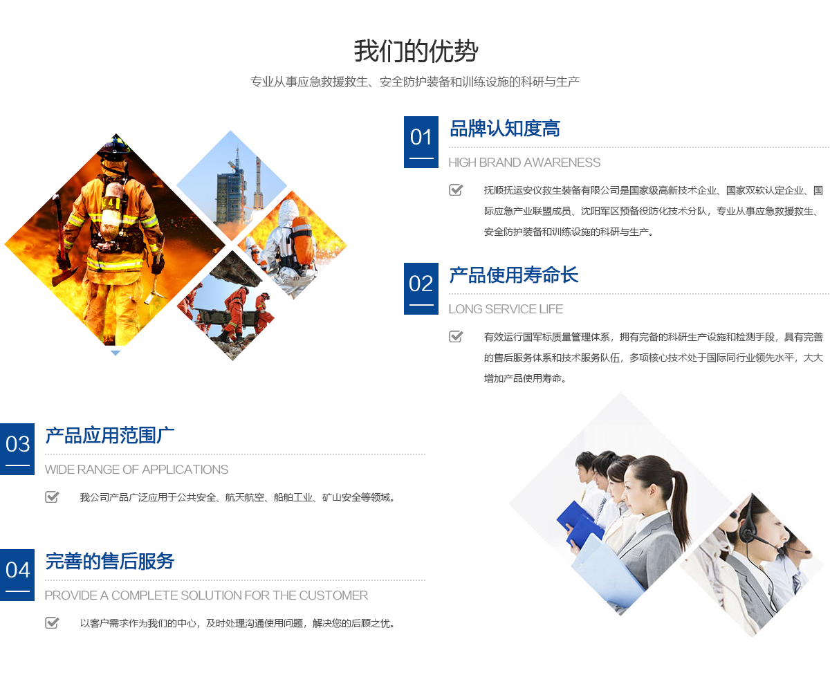 于國(guó)際同行業(yè)領(lǐng)先水平,已經(jīng)形成應(yīng)急救援救生、訓(xùn)練和保障三大類(lèi)多種系列產(chǎn)品,通過(guò)了MA、